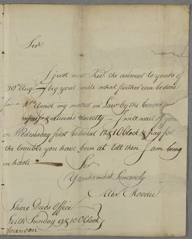 | Summary | Letter from Alexander Moodie, Shore Dues Office, Leith, regarding the case of his mother-in-law Mrs Arnot. His letter is included with one from Robert Menzies, from Cunnoquhie, also regarding Mrs Arnot. Delivered 'express'. |