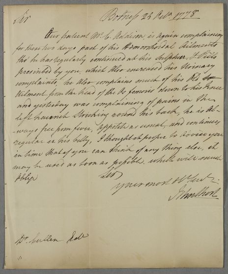 [ID:1574] From: Mr John Short / To: Dr William Cullen (Professor Cullen) / Regarding: Mr Charles Addison (Patient) / 25 October 1778 / (Incoming)