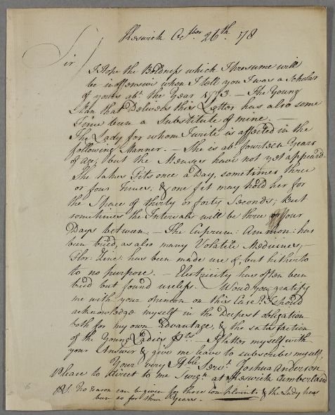 [ID:1576] From: Joshua Anderson / To: Dr William Cullen (Professor Cullen) / Regarding: Anonymous (Patient) / 26 October 1778 / (Incoming)