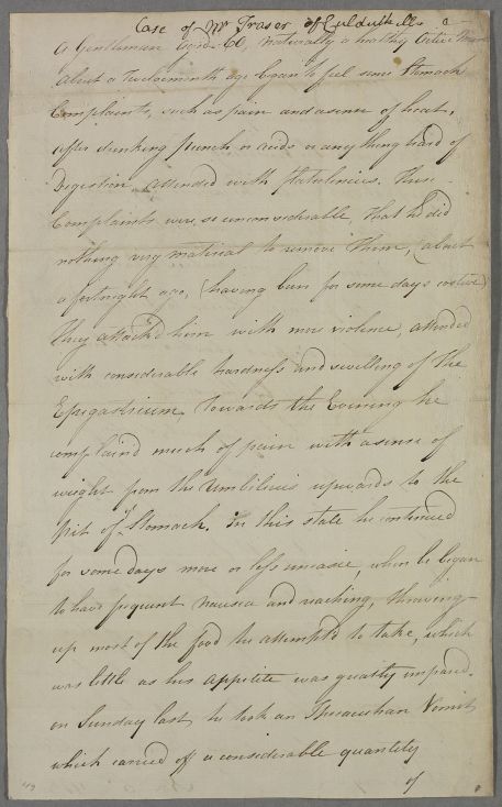Case of Mr Fraser of Culduthill who has a painful stomach disorder with vomiting which Cullen attributes to the pressure of a tumour. |
