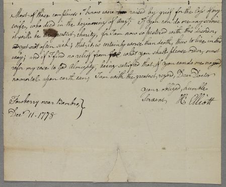 | Summary | Letter from H. Elliott in Fowberry, concerning his own case, which has been worsened by the death of his wife. |