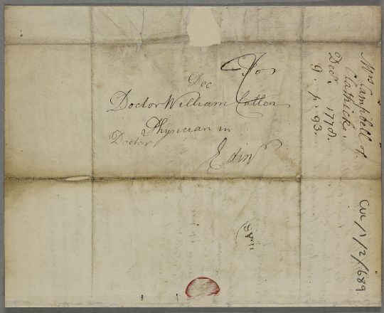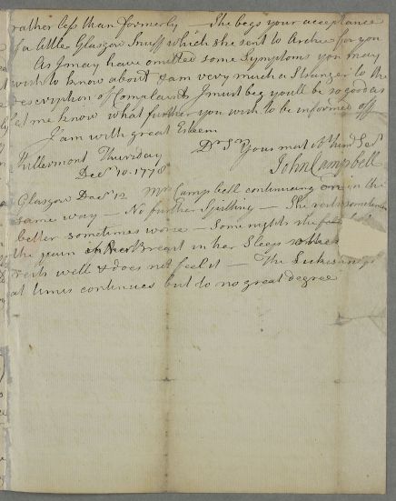 [ID:1599] From: Provost John Campbell (Coates) (of Clathick and Killermont) / To: Dr William Cullen (Professor Cullen) / Regarding: Mrs Agnes Campbell (Colquhoun) (of Clathick and Killermont) (Patient) / 10 December 1778 / (Incoming)