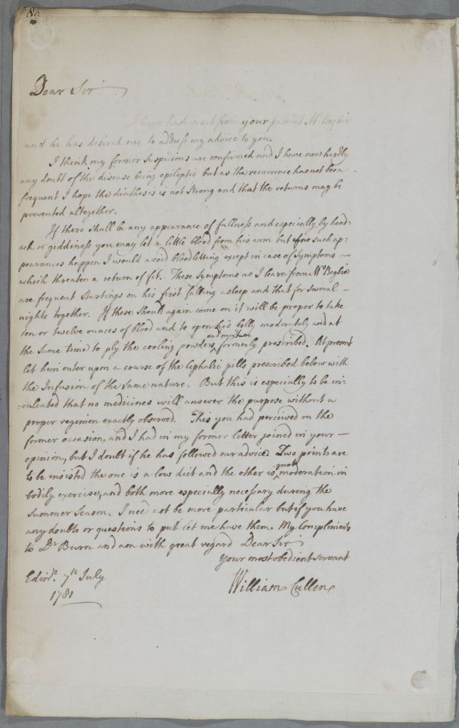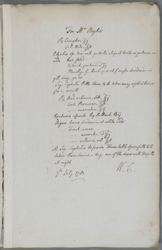 | Summary | Reply with directions toan unnamed practitioner concerning suspected epilepsy of a Mr Begbie who had recently visited Cullen i person; encloses a recipe for 'Cephalic pills'. Cullen sends compliments to a Dr Burn. |