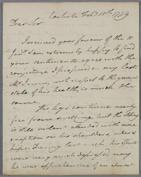 [ID:1624] From: Dr John Heysham / To: Dr William Cullen (Professor Cullen) / Regarding: Mr Thomas Irwin (Irwine, at Moss Side) (Patient) / 11 February 1779 / (Incoming)