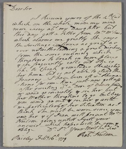 [ID:1627] From: Mr Robert Neilson (Nielson, of Paisley) / To: Dr William Cullen (Professor Cullen) / Regarding: Mr Robert Neilson (Nielson, of Paisley) (Patient), Miss Margaret Neilson (Peggy) (Patient) / 16 February 1779 / (Incoming)