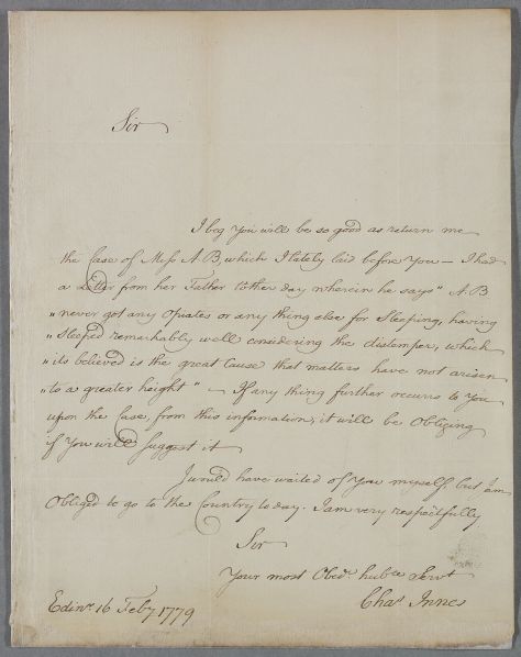 [ID:1628] From: Mr Charles Innes / To: Dr William Cullen (Professor Cullen) / Regarding: Miss (A.B.) (Patient) / 16 February 1779 / (Incoming)