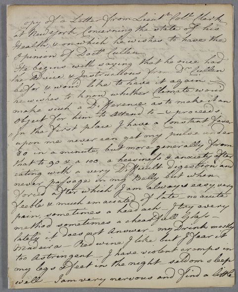 Copy of a letter from Lieutenant Colonel Clerk, in New York, concerning his own case. This copy of the Colonel's original letter is in the hand of his brother, Robert Clerk of Mavisbank. He is being attended by Dr Blagden who studied at Edinburgh. Undated, but probably from February 1779.