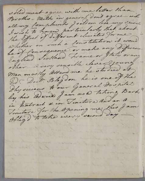 | Summary | Copy of a letter from Lieutenant Colonel Clerk, in New York, concerning his own case. This copy of the Colonel's original letter is in the hand of his brother, Robert Clerk of Mavisbank. He is being attended by Dr Blagden who studied at Edinburgh. Undated, but probably from February 1779. |