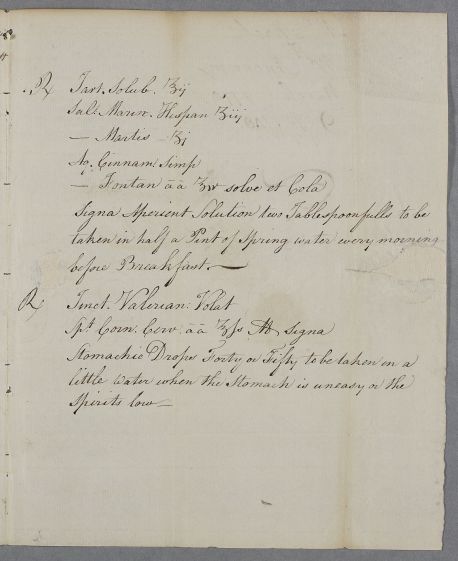 Take half an ounce each of Tincture of Volitile Valerian and Spirits of Hartshorn Mix. Label: Stomachic Drops Forty or Fifty to be taken in a little water when the Stomach is uneasy or the Spirits low.