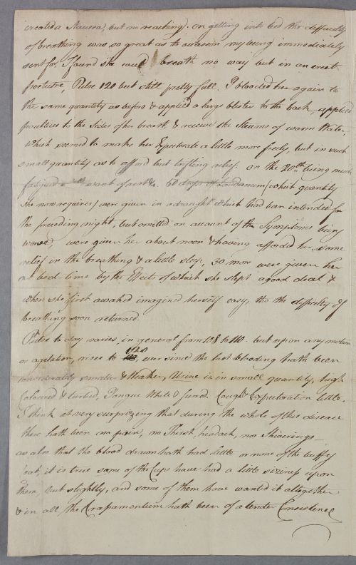 | Summary | Letter from William Wightman concerning Mrs Grieve, giving a detailed 'journal' of her recent symptoms. She is now suffering from breathing difficulties, with some streaks of blood in expectoration. He has been using tussilago, opiates, beeding and blistering. A handstamp reads 'Press'. |