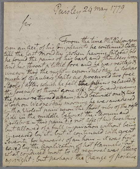 [ID:1679] From: Dr Alexander Taylor (Sanders) / To: Dr William Cullen (Professor Cullen) / Regarding: Mr Robert Neilson (Nielson, of Paisley) (Patient) / 24 May 1779 / (Incoming)