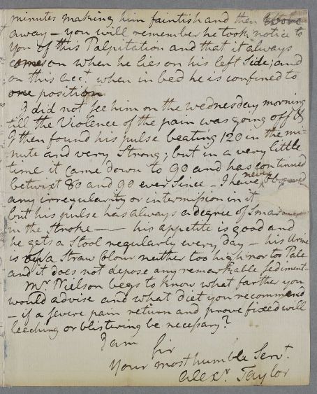 Case of Mr Robert Neilson with a chronic, progressive illness, probably pulmonary (consumption) but possible cardiac. After a gap, in early January 1782, Cullen confirms that Neilson's condition is terminal. An autopsy soon follows. |