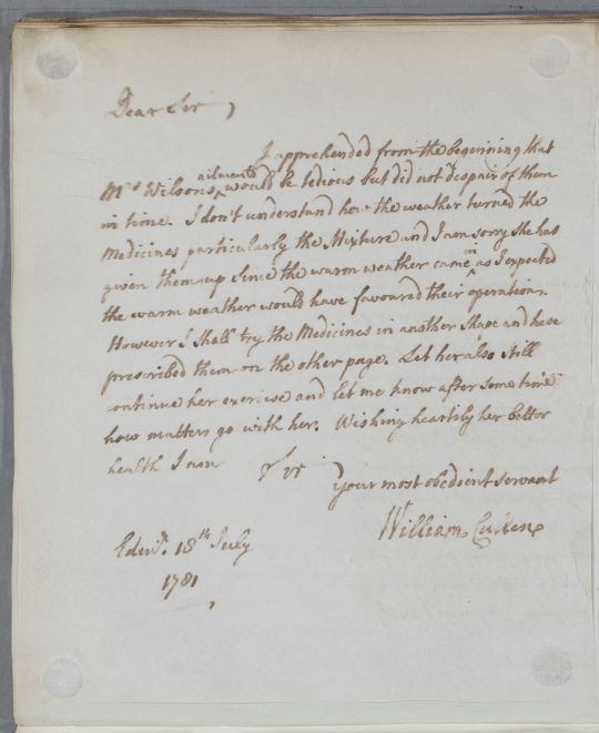 Reply concerning the case of Mrs Wilson. She seems to have given up on the medicines Cullen prescribed, claiming that the warm weather turned them.