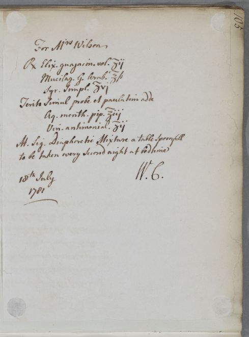 [ID:168] From: Dr William Cullen (Professor Cullen) / To: James Wilson (Willson) / Regarding: Mrs Wilson (Willson) (Patient) / 18 July 1781 / (Outgoing)