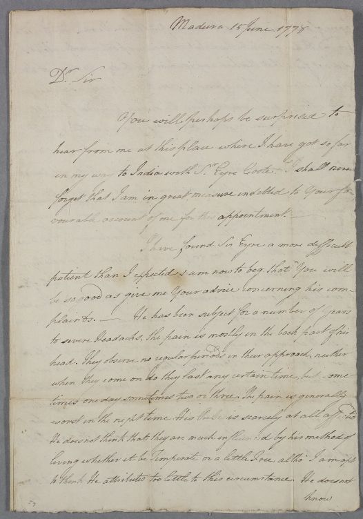 Letter from Robert Bruce, Madeira, concerning the case of Sir Eyre Coote. Bruce, who owes his position to Cullen, is en-route to India as Cootes' personal physician and asks if he can send Cullen any information on diseases etc. when he reaches Calcutta. Mr Adair of London was Sir Eyre's previous physician.