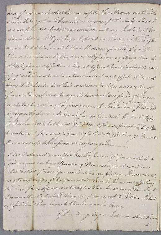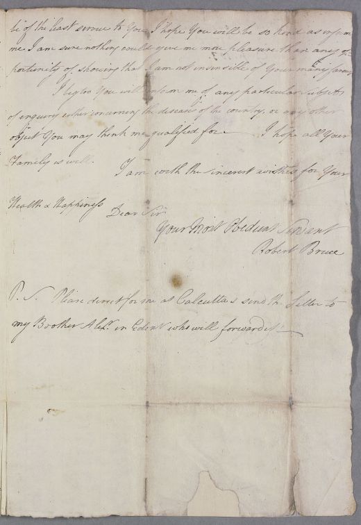 | Summary | Letter from Robert Bruce, Madeira, concerning the case of Sir Eyre Coote. Bruce, who owes his position to Cullen, is en-route to India as Cootes' personal physician and asks if he can send Cullen any information on diseases etc. when he reaches Calcutta. Mr Adair of London was Sir Eyre's previous physician. |