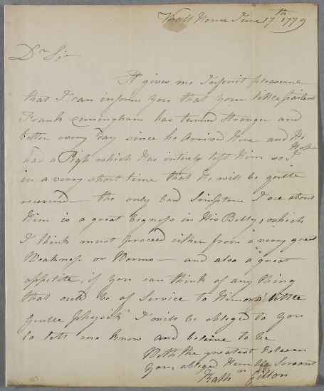 [ID:1691] From: Mrs Katherine Gillon (Agnew) (Gillean; of Wallhouse ) / To: Dr William Cullen (Professor Cullen) / Regarding: Mr Frank Cunningham (Cunninghame) (Patient) / 17 June 1779 / (Incoming)