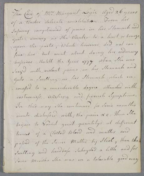 Case of Mrs Margaret Logie of Shetland, who has a long-standing stomach and abdominal complaint. |