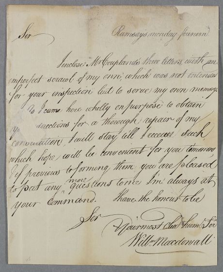 Letter from William Mcdowall sent prior to a personal consultatation and serving as the covering letter for three letters from his Dumfries surgeon Mr Alexander Coupland and one from himself concerning his case (See Documents 1797; 1697 & 1701. Letter indicates that Mcdowall was staying at 'Ramsay's' i.e. Andrew Ramsay lodgings, Old Assembly Close, and Milne Square.