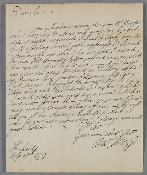 [ID:1708] From: Dr Alexander Wemyss (of Pitkenny) / To: Dr William Cullen (Professor Cullen) / Regarding: Mr John Brodie (Patient) / 18 July 1779 / (Incoming)