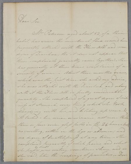 | Summary | Letter from William Hamilton concerning the case of Mrs Paterson who suffers from recurring bowel and urinary problems. |