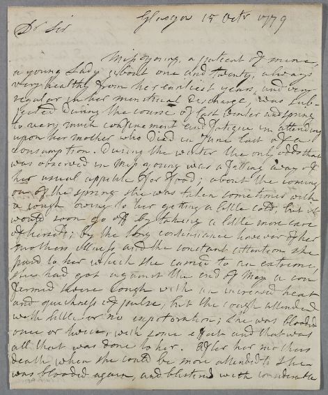 [ID:1742] From: Dr Robert Marshall / To: Dr William Cullen (Professor Cullen) / Regarding: Miss Young (Younge) (Patient) / 15 October 1779 / (Incoming)