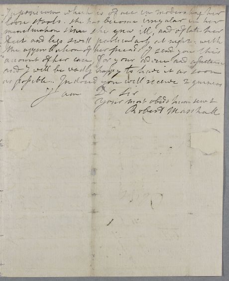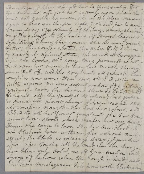 Letter from Dr Robert Marshall concerning the case of Miss Young whose efforts in caring for her ill mother seem to have damaged her own health. She is consumptive and a recent stay in the countryside near the sea where she could sail and bathe helped her condition, but it has relapsed since returning to town last month.