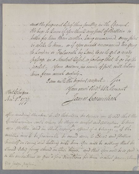 | Summary | Letter from James Carmichael concerning Captain Robertson who is arranging to go south for his health but has fears about sailing at this time of year and because of the risk of capture by the Spanish or French who had become formal allies of Revolutionary America. |