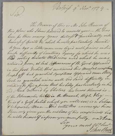[ID:1753] From: Mr John Short / To: Dr William Cullen (Professor Cullen) / Regarding: Mr John Pearson (Patient) / 9 November 1779 / (Incoming)