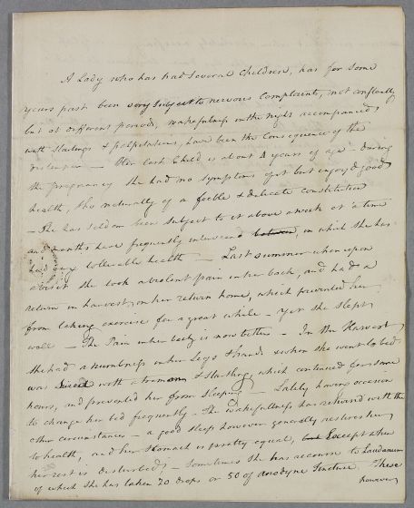 | Summary | Unsigned case note in the hand of John Buchan, WS, concerning his sister, Marion, wife of Robert Cathcart of Genoch, compiled from information sent by letter. She has borne several children, and now suffers back pain, numbness and disturbed sleep. The external annotation mistakenly names her as 'Mrs. Ross': in Doc 1491, Buchan refers to Cullen having made an error with her name. |
