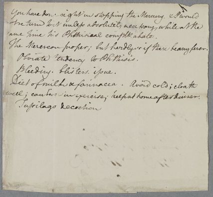 Brief notes on directions and possible treatment, written on the reverse of an incoming letter; probably a summary draft of an outgoing letter. No date, although must have been written after Cullen's move to Edinburgh in 1755 given the incoming letter's address. Categorised as an outgoing document because the substance is the retained summary of Cullen's advice to an unnamed patient.