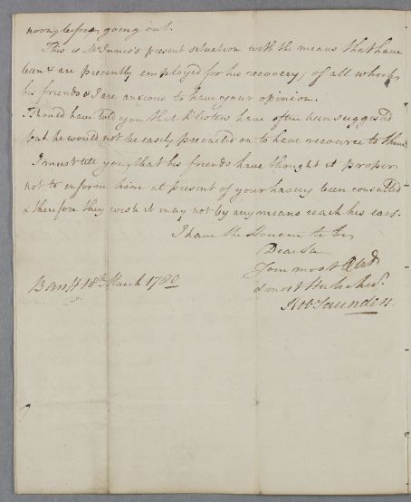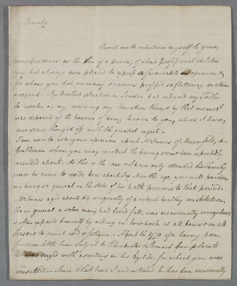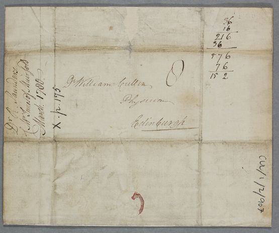 | Summary | Letter from Robert Saunders, the son of Banff physician James Saunders, concerning the case of Mr Innes of Muirifold. Scribbled as evidence of commercial posting. Mentions having studied medicine under his older brother [William] at London. |