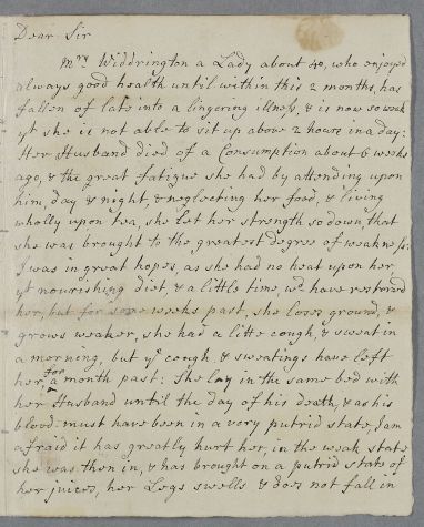 | Summary | Letter from Henry Richardson concerning the case of Mrs Widdrington, who has recently become weak after nursing her consumptive husband who died about six weeks earlier. |