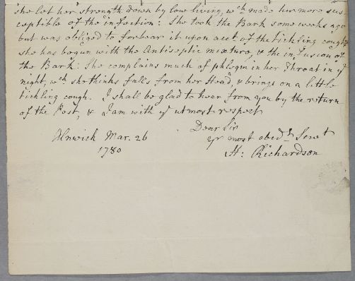[ID:1830] From: Dr Henry Richardson / To: Dr William Cullen (Professor Cullen) / Regarding: Mrs Isabella Widdrington (Forster) (Isabel) (Patient) / 26 March 1780 / (Incoming)