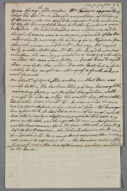 Notes from Lord Daer's letters home concerning the state of his health, probably made by Lady and Lord Selkirk.