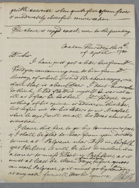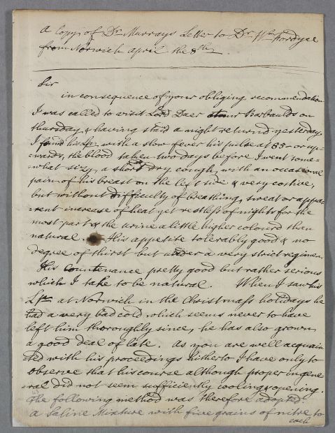 | Summary | 'A copy of Dr Murrays Letter to Dr Wm Fordyce from Norwich', concerning the case of Lord Daer [the son of the Earl of Selkirk] |