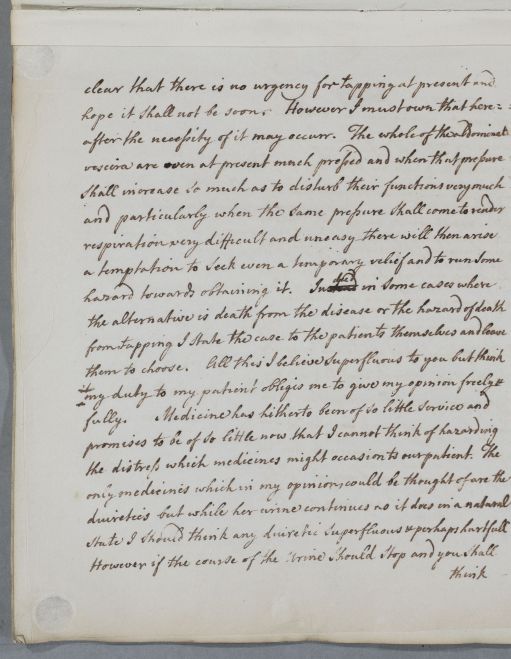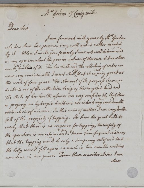Case of Mrs Gordon of Craigmile who has a weak chest and whose fluid retention, in Cullen's opinion, does not warrant surgical tapping. |