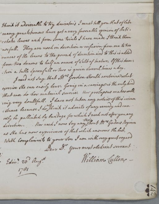 [ID:185] From: Dr William Cullen (Professor Cullen) / To: Dr Thomas Livingston / Regarding: Mrs Isabel Gordon (Isabel McCulloch Gordon; of Greenlaw and later Craigmile) (Patient) / 23 August 1781 / (Outgoing)