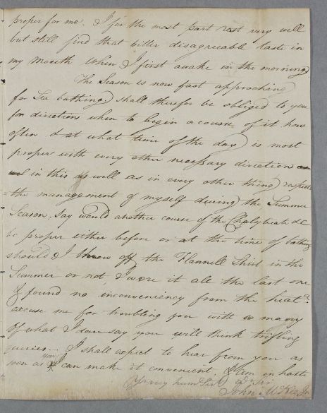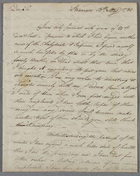 | Summary | Letter from John McKie at Stranraer concerning his own case; Cullen had written to him on 21 Dec. 1779. He has had a better winter than the last and now seeks advice on sea-bathing. |