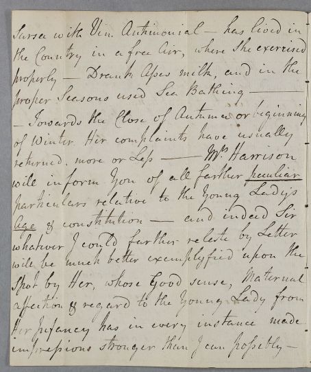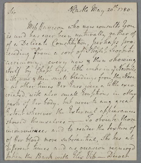 Letter from Newcastle surgeon Richard Lambert concerning the case of Miss Harrison 'who now consults you' (probably hand-delivered by the patient who was to be accompanied by her mother, Mrs Harrison who has always impressed Lambert by her 'maternal affection' towards her daughter. Scorbutic.