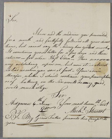 | Summary | Short letter from Michael Stewart concerning his own case of scurvy, and adding that '[m]y Grandfather presents his Compts. to you'. A note on the reverse states 'wish for a more particular account'. |