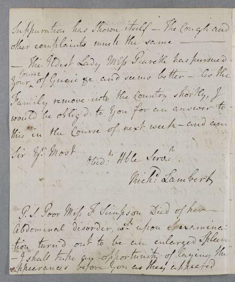 | Summary | Letter from Richard Lambert concerning the cases of the Misses Peareth and mentioning also the death of Miss Frances Simpson. |