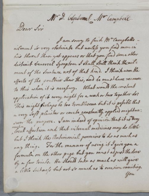 | Summary | Reply, 'Mr D Colquhon C[oncerning] Mr Campbell'; Cullen disagrees with the physician that the complaint is venereal. |