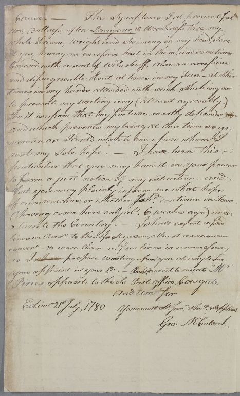 [ID:1885] From: Mr George M'Culloch (Maculloch, Macullock) / To: Dr William Cullen (Professor Cullen) / Regarding: Mr George M'Culloch (Maculloch, Macullock) (Patient) / 21 July 1780 / (Incoming)