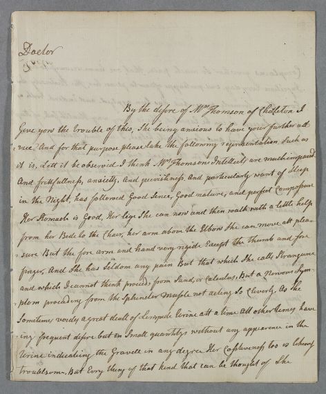 Case of Mrs Thomson of Charlton who suffers from sleeplessness and abdominal pains described as hypochondriasis. She is later suspected of having bladder stones and has a paralysis in the arm. |
