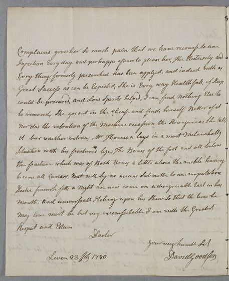 | Summary | Letter from David Goodsir, Leven, concerning the case of Mrs Thomson of Charleton: 'Lett it be observed I think Mrs Thomsons Intellects are much impaired.' She can now walk a little with assistance and can go out in a chaise, but her arm is still partly paralysed and her urinary tract complaints continue. The electricity has been used. Meanwhile, her husband is in a dangerous condition due to a leg fracture, now carious, and 'will by no means submitte to an amputation'. |