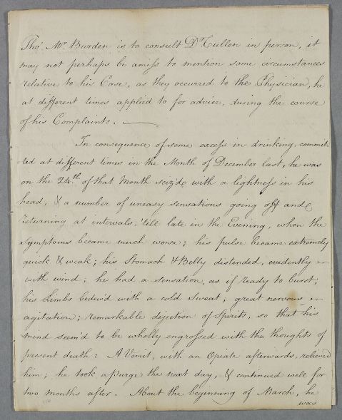 | Summary | Unsigned case note describing the case of Captain Burden who is to consult Cullen in person. He has had a range of ailments, mostly dyspeptic, with giddiness, loss of appetite and low spirits, which seem to be connected to heavy drinking. He has lost a lot of weight, having previously been corpulent. |