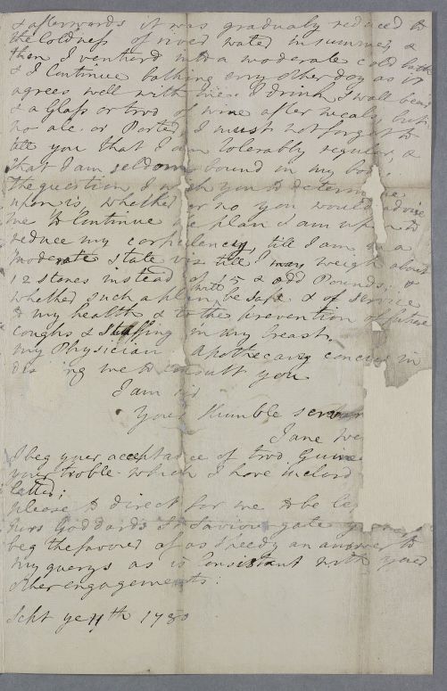 Letter from Jane Webster at York concerning her own case. She seeks advice on how to continue to lose weight. Mentions in passing seeking past advice from her local physician, who is identified elsewhere as Edinburgh trained Dr Thomas Withers.