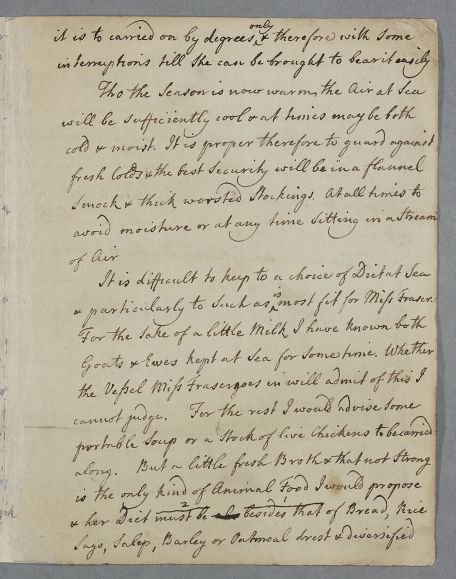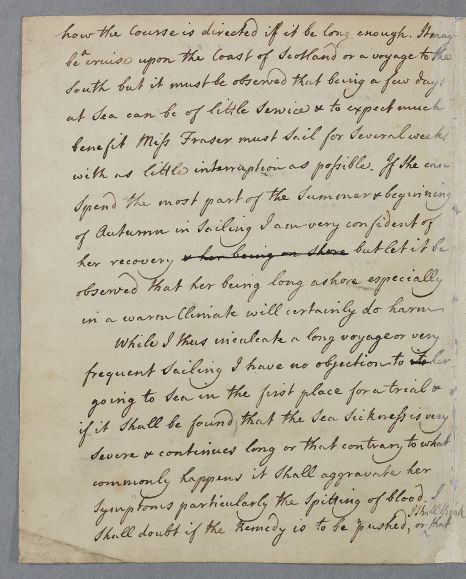 Directions, in the form of a retained draft in Cullen's own hand with editorial marks, for Miss Fraser of Inverallochy who is given some detailed advice on taking a boat trip for her health. Undated but presumably around November 1780, Cullen mentions also writing to her local physician Dr Skene who, based on date, has been assumed to be Cullen's from pupil, Dr George Skene of Aberdeen.