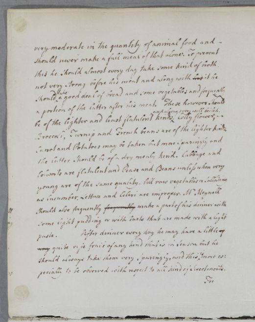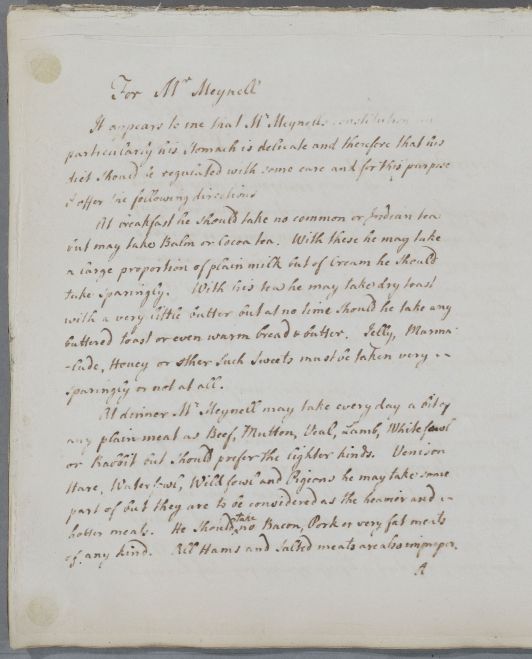 Reply, 'For Mr Meynell'. Cullen gives directions, chiefly dietary, in regards to young Mr Meynell's 'delicate' constitution and stomach.